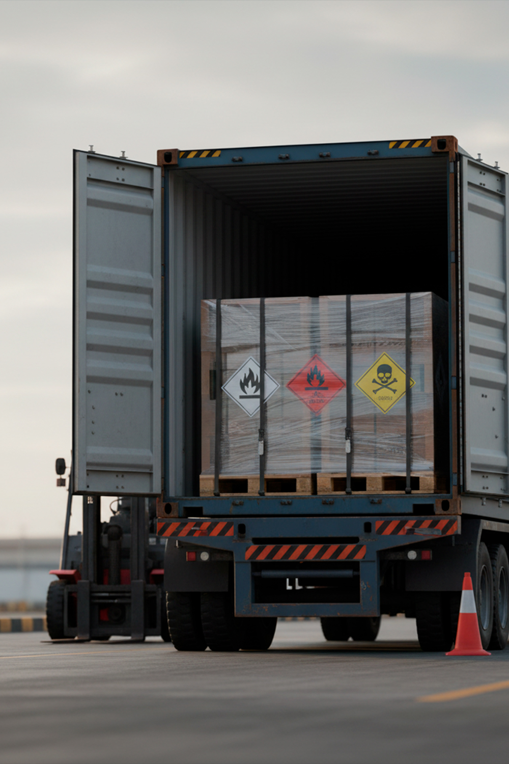 Transporte seguro de mercancías peligrosas, asegurando el cumplimiento de las regulaciones para su manejo y transporte.